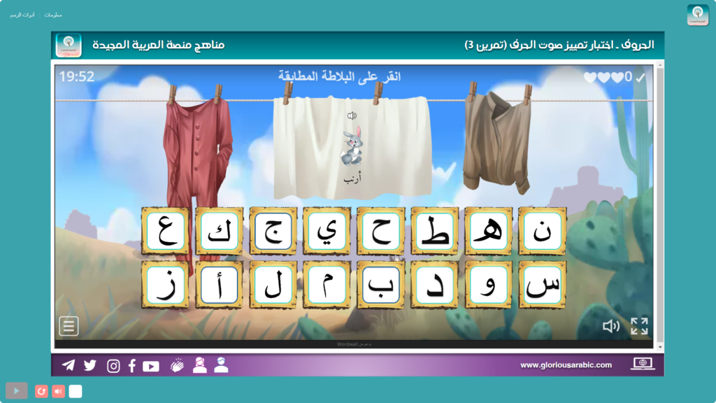تمرين صوتي تفاعلي لتعلم أصوات الحروف العربية، ويمكن اختبار الطالب بإتقانه لأصوات الحروف، اختيار من الكل